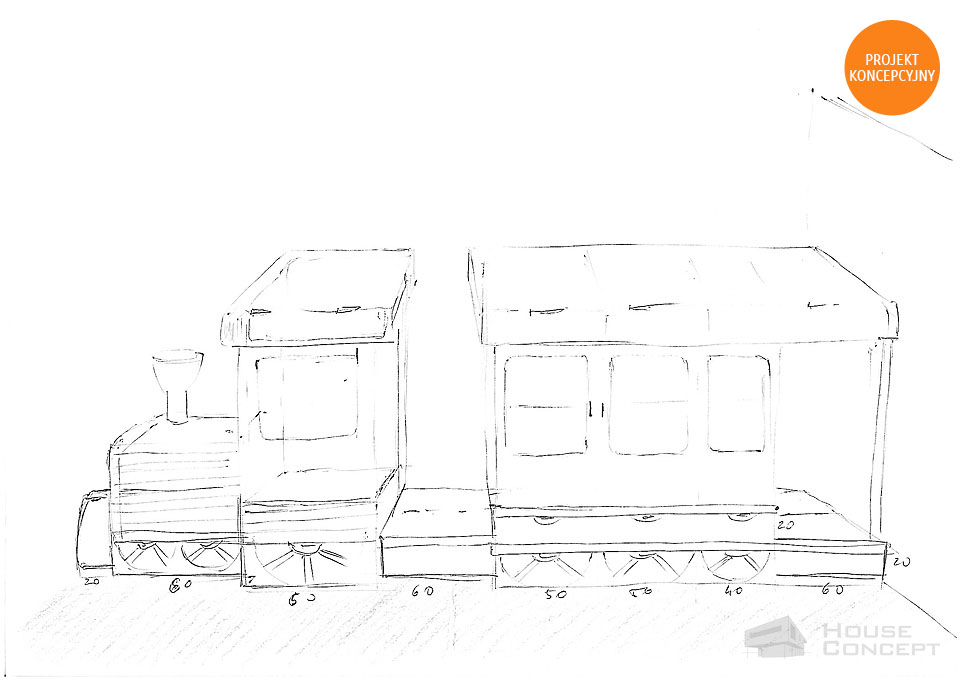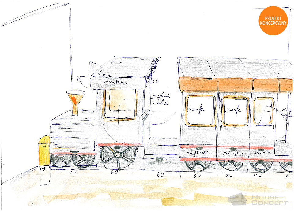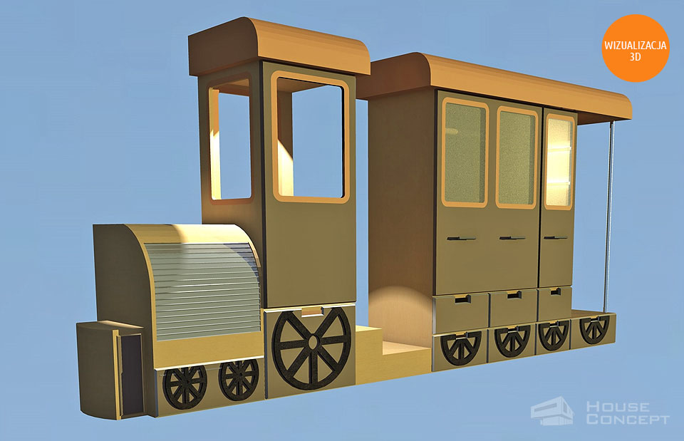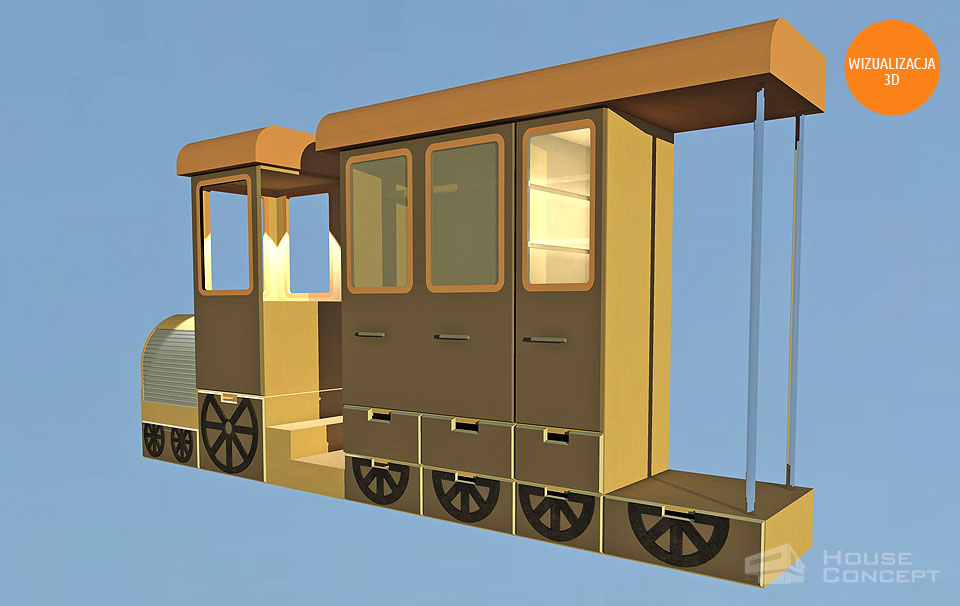Projekt mebli do pokoju dziecięcego w którym motywem przewodnim miała być lokomotywa. Na ścianach zaprojektowano cytaty i grafiki z wiersza Juliana Tuwima pt. ”Lokomotywa”. Projektowana meblościanka poza oryginalnym wyglądem jest również funkcjonalna poprzez liczną ilość szuflad znajdujących się w kołach ciuchci, pojemników na pościel w dachu lokomotywy i jej wagonach, dodatkowo wagony zostały zaprojektowane jako garderoba dwuskrzydłowa i witryna z oświetleniem ledowym. W silniku lokomotywy zaprojektowano szafkę z roletą przeznaczoną na książki i inne drobiazgi a w pługu przymocowanym do lokomotywy zaś pojemnik na zabawki. Kabina lokomotywy jest zaprojektowana tak żeby można było do niej wejść i ze środka uruchomić sygnał dźwiękowy.