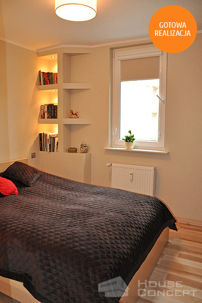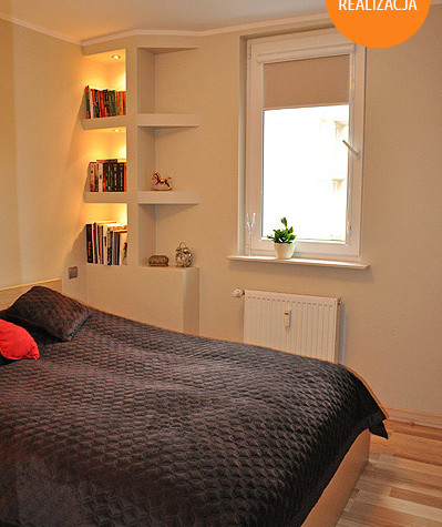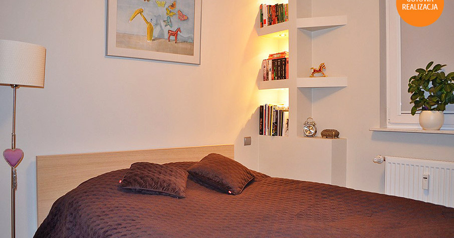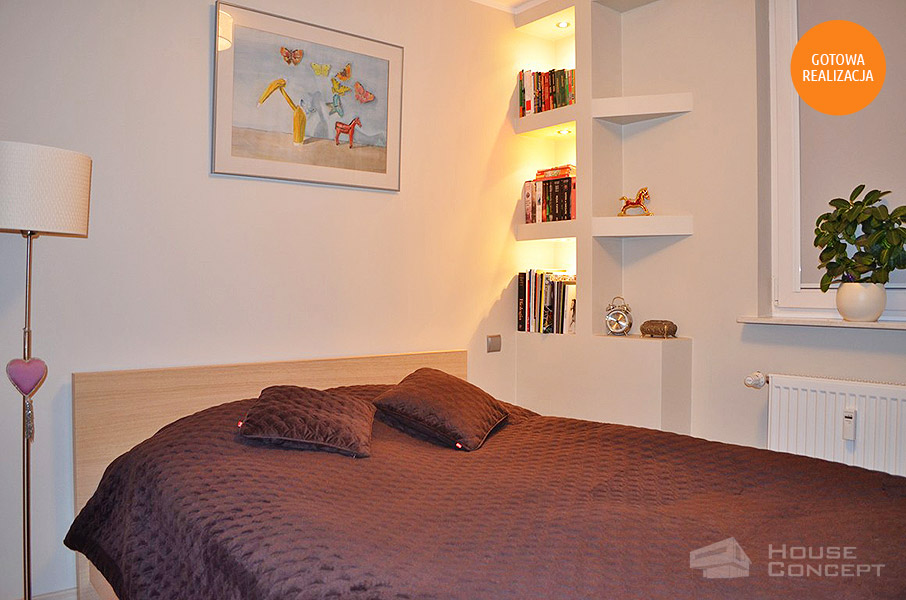 - maksymalne wykorzystanie małego metrażu w celu uzyskania komfortowej przestrzeni mieszkalnej dla 2/3 osób dzięki wykonaniu szaf wnękowych w sypialni oraz łazience