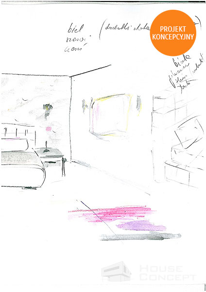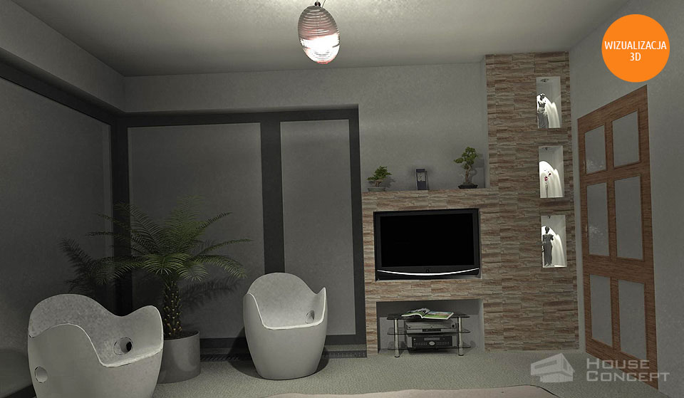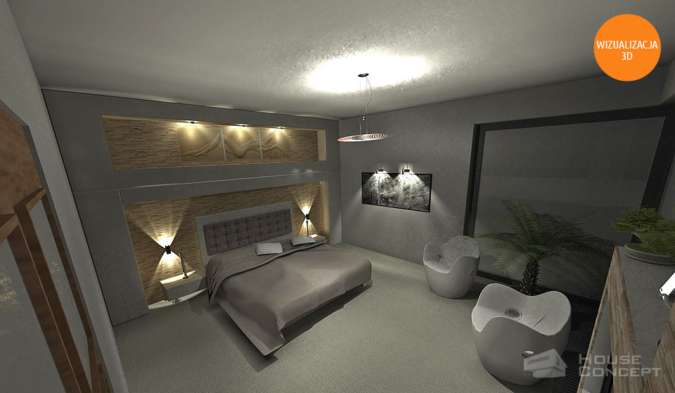 Propozycja aranżacji sypialni z zabudową zlokalizowaną za łóżkiem będącą częściowo meblami wykonywanymi na wymiar i powyżej zabudową z płyt kartonowo gipsowych. Naprzeciw łóżka propozycja obudowy kanału wentylacyjnego z wykorzystaniem miejsca na telewizor.