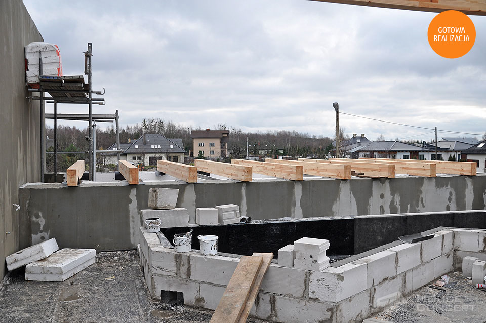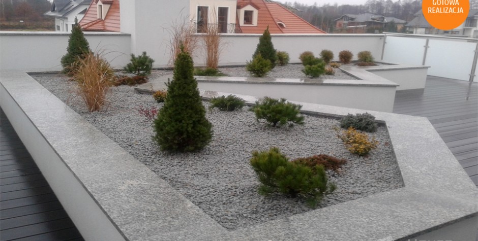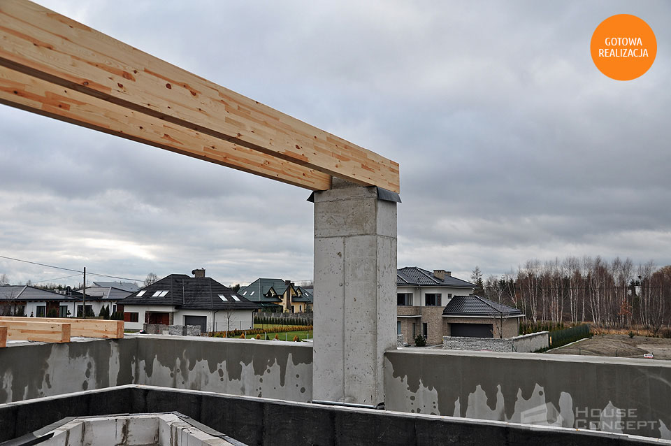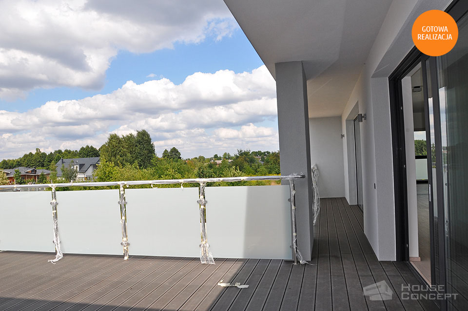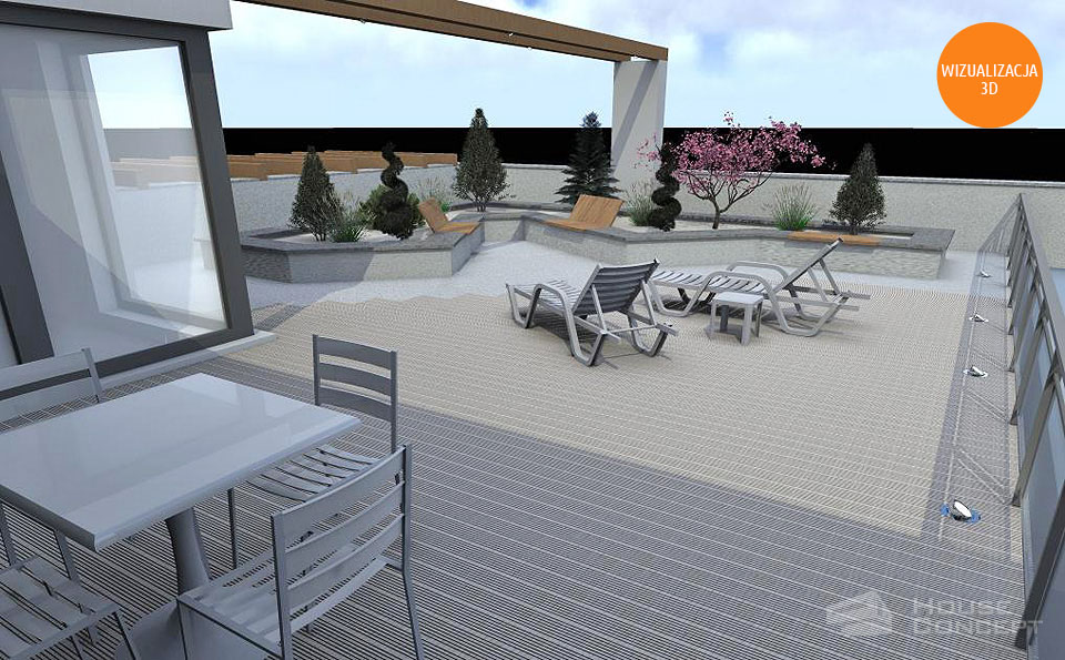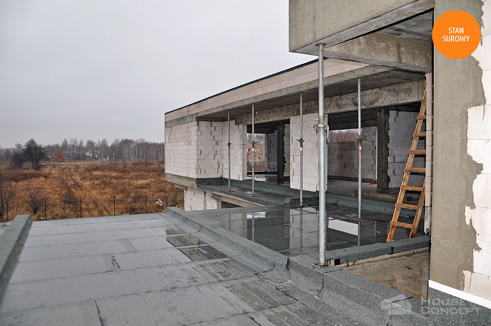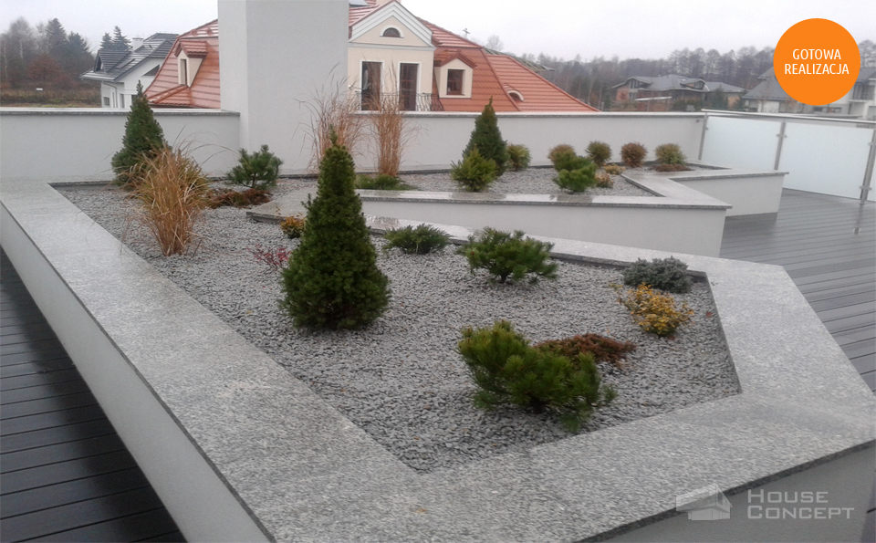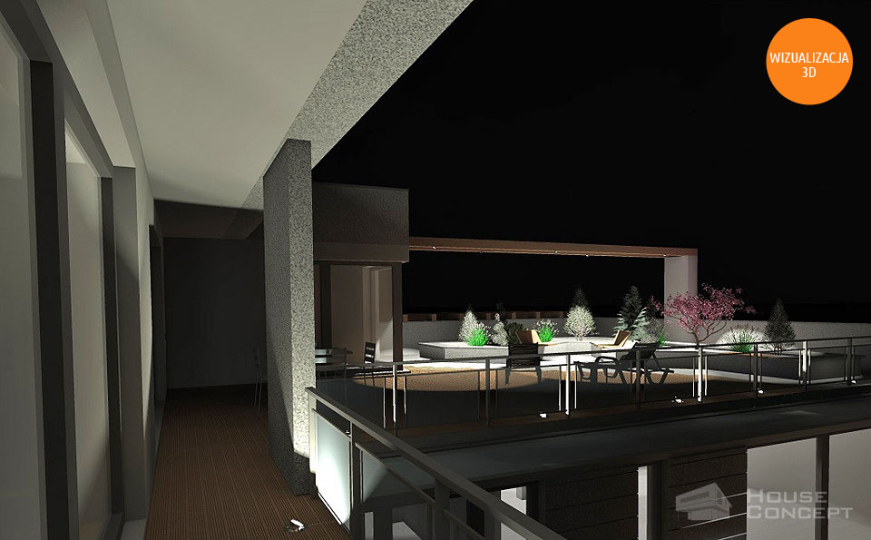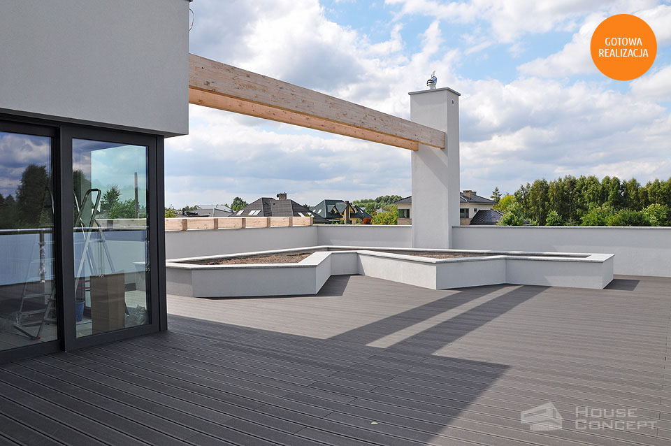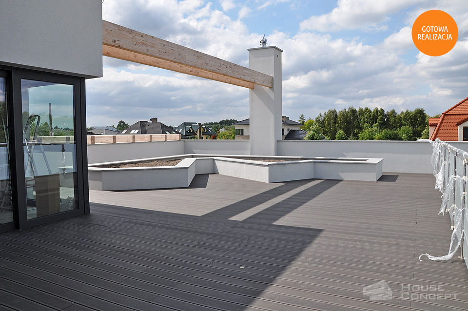 Projekt tarasu nad salonem zrodził się w momencie powstania stanu surowego budynku kiedy rozmiary jego powierzchni przerosły oczekiwania inwestora i zaszła potrzeba zaaranżowania i zagospodarowania ponad 130 m2 powierzchni. Większą część poświęciliśmy olbrzymiej donicy na roślinność dodatkowo nad nią zostały umieszczone między attyką sypialni a kominem dwie belki z drewna klejonego, które miały zniwelować większą jego część wystającą ponad taras. Pozostała część tarasu wystarczy na rekreacyjne użytkowanie. Powierzchnia tarasu została zaprojektowana z deski kompozytowej pod którą znajduje się wyspadkowana powierzchnia z miksokreta w której zostały umieszczone podgrzewane wpusty dachowe odwodnienia dachów i tarasów, rury spustowe zostały ukryte w elewacji a woda opadowa za pomocą stacji rozsączania przedostaję się do gruntu. Barierki wykonano z szczotkowanego aluminium z wypełnieniem ze szkła mlecznego. Nad oknami salonu wychodzącymi na taras zaprojektowano zadaszenie liniowe o szerokości 140cm które ostatecznie nie zostało zamocowane ze względów dostępności materiału który miał być sprowadzany z Hiszpanii.