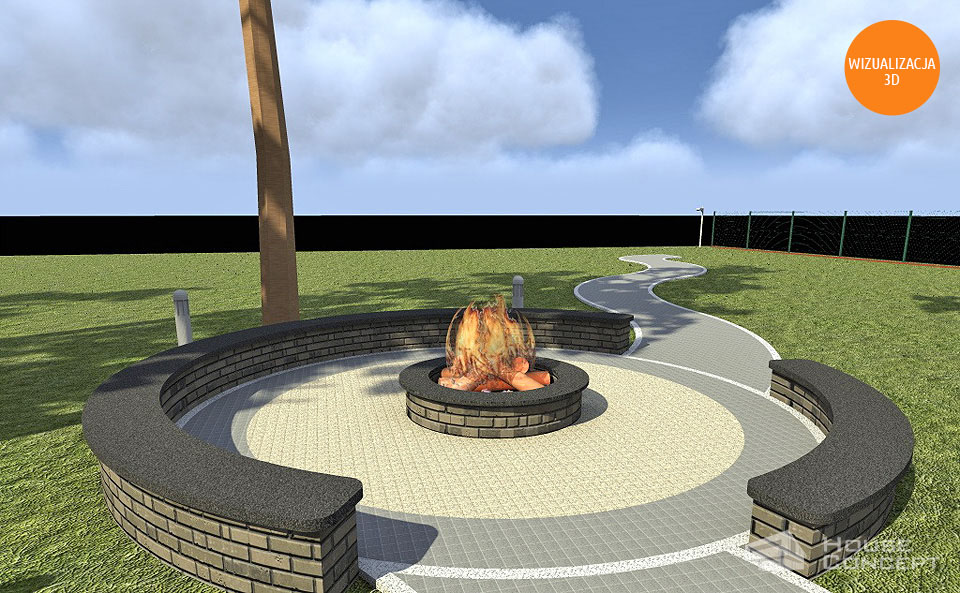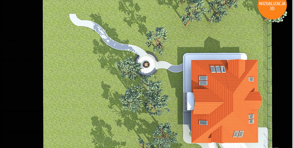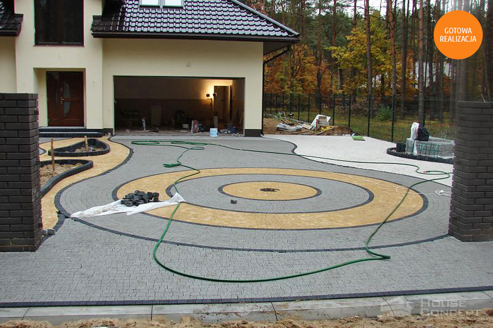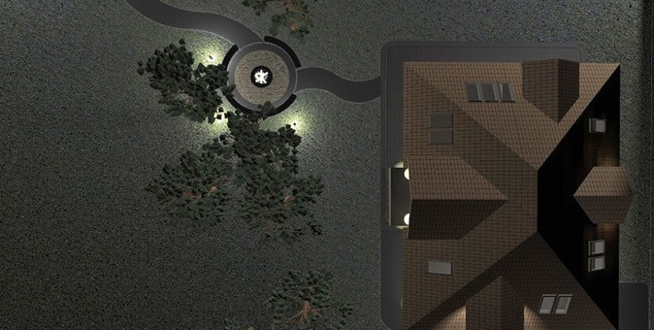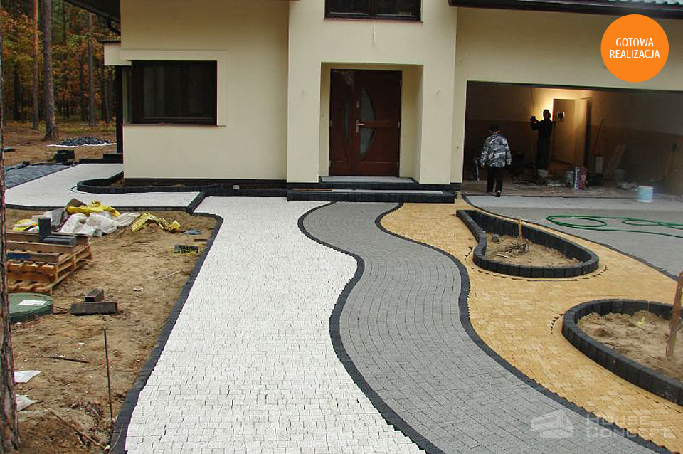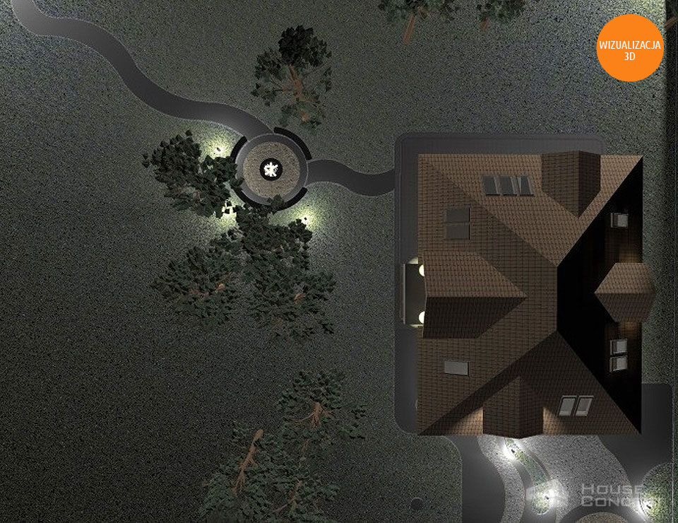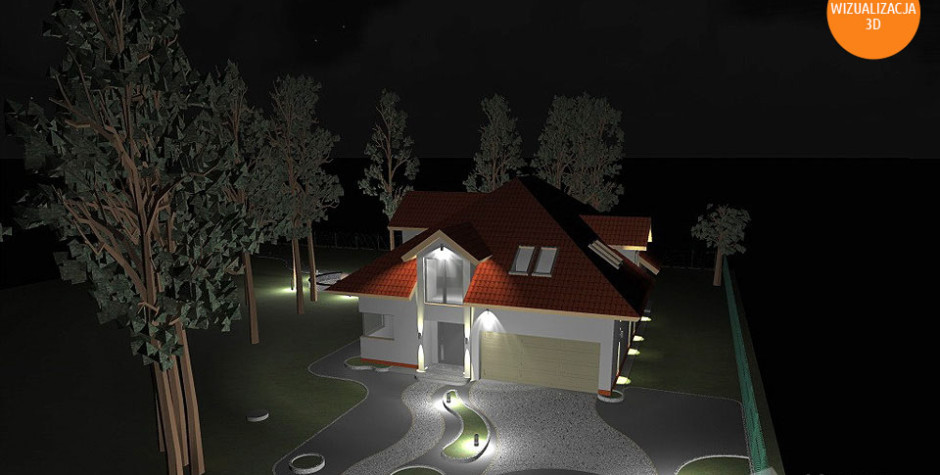 Dom jednorodzinny zlokalizowany w Ustroniu pow. Zgierski. Zlecenie zakładało wykonanie projektu elewacji i oświetlenia budynku wraz z placem znajdującym się przed nim. Życzeniem inwestora było zaproponowanie niebanalnego układu kostki brukowej na drodze i ścieżce prowadzącej do budynku. Dodatkowo po lewej i prawej stronie wykonano klomby wygrodzone palisadami na roślinność i oświetlenie ogrodu. Cokoły budynku zostały częściowo wymurowane z cegły klinkierowej tak samo jak ogrodzenie posesji nawiązującej kolorystyką do pokrycia dachowego a częściowo zostały wykonane jako opaska z wypełnieniem z drobnoziarnistego kruszywa ograniczona palisadą. Na tyłach budynku wykonano taras z którego można przejść do ogniska znajdującego się wewnątrz działki.